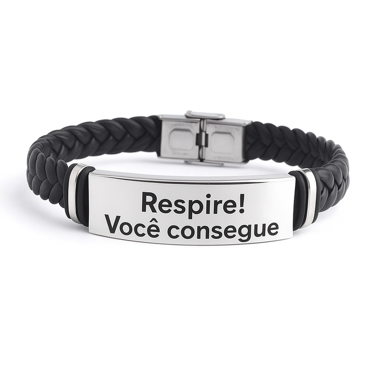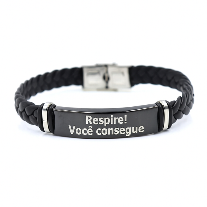 Essa pulseira vai além da estética. Gravada com a frase Respire! Você consegue, ela carrega um lembrete diário de calma e força, sempre ao alcance do seu olhar. Em momentos de crise, basta olhar para o pulso e lembrar que você tem o controle. Imagine ter em suas mãos um símbolo de superação pessoal — não apenas um acessório, mas um aliado silencioso que te acompanha em cada desafio. Feita em couro trançado e aço inoxidável de alta durabilidade, essa pulseira combina estilo, resistência e propósito. Cada detalhe foi pensado para transmitir segurança e confiança.